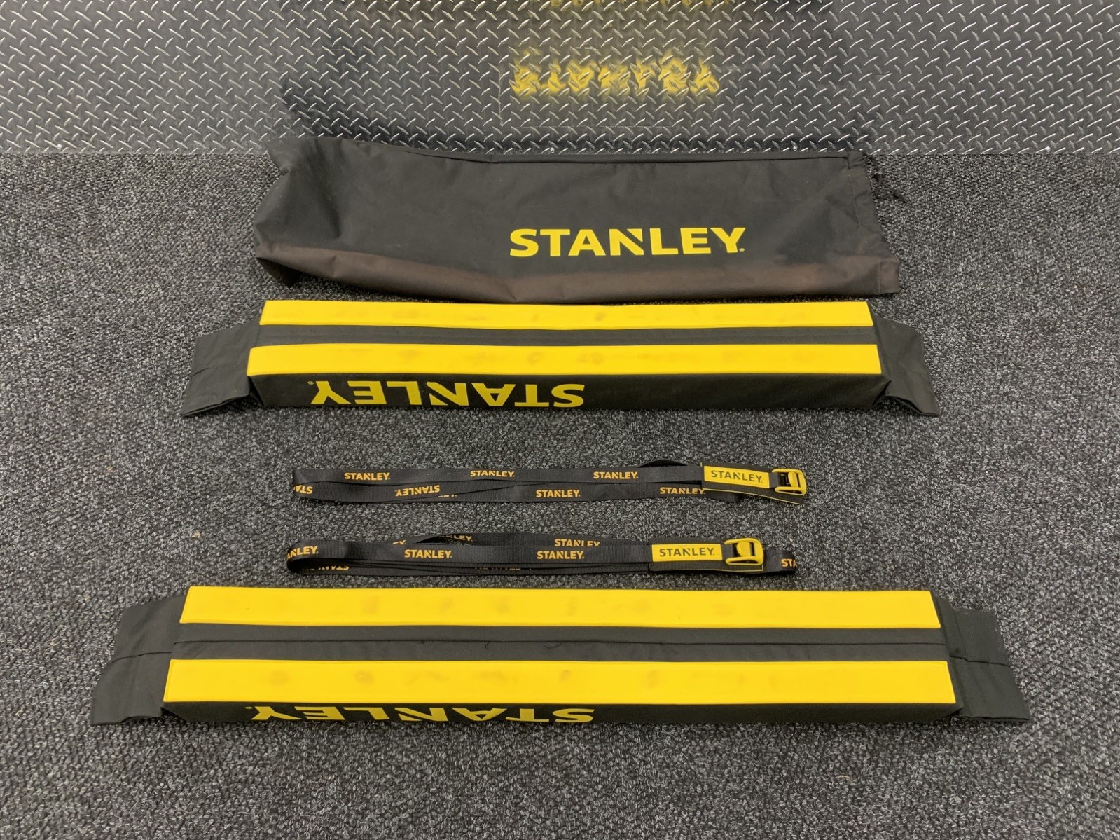 The product is a used Stanley car roof top rack pad luggage cargo carrier transporting system, specifically the Stanley S4000 model made in China. This system is designed to securely transport luggage or cargo on the roof of a vehicle, providing a convenient and practical solution for transporting items. The brand Stanley is known for its quality and durability in the market, making this product a reliable choice for those in need of a roof transport system. Comes with two Rack Pads, two 20' foot locking straps, and storage bag which has some fading but no rips or cuts.