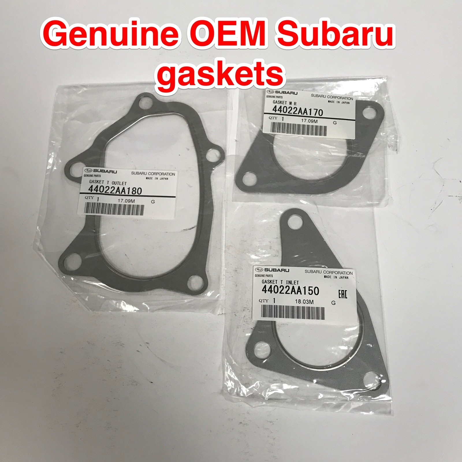 Turbo\_Crafts is pleased to offer this turbo gasket kit for the Subaru vehicles listed below. This kit consists of genuine Subaru parts as well as Turbo\_Crafts upgraded part that performs better than OEM at a lower cost; it is a win-win for both your Subie and your wallet! :) **SPECIFY TURBO MODEL** The drain gasket on the IHI VF-series turbos and TD04 turbos is different. Our standard shipping package includes the oil drain gasket for the IHI VF-series turbos. If you have a Subaru with a TD04 turbo, please make a 'note to seller' at check out or message us with the vehicle year/model or turbo model so we can supply you correct drain gasket. If you go to the dealer and piece together this same kit, you will spend $91.47 Buy the same genuine Subaru parts at a fraction of the dealership price!!! When rebuilding customer's turbos, we always supply this same gasket kit with every rebuilt turbocharger. We also sell Subaru turbo gaskets individually. If you have any questions or requests, don't hesitate to contact us. \-\-\----------------------------- **COMPATIBILITY** (This turbo service kit is compatible with the following turbochargers) -VF22, JDM V3 STI & 22B, EJ22 engine, single P20 housing; PN: 14411AA143 -VF23, JDM V3 STI EJ20 engine, single P20 housing; PN: 14411AA172 -VF24, JDM V4 STI EJ20 engine, single P18 housing; PN: 14411AA201 -VF28, JDM V5 STI EJ20 engine, single P20 housing; PN: 14411AA291 -VF29, JDM V5 STI EJ20 engine, single P18 housing; PN: 14411AA300 -VF30, JDM STI EJ20, single scroll P18 housing; PN: 14411AA373 -VF34, JDM STI EJ207 engine, single scroll P18 housing, ball bearing; PN: 14411AA321 -VF35, same turbo as the VF30 with a smaller single scroll P15 housing; PN: 14411AA440 or 14411AA443 -VF39, USDM 2004-2006 STI, EJ257 engine, single scroll P18 housing; PN: 14411AA572 -VF40, USDM 2005-2006 Legacy GT and Outback XT, EJ255 engine; PN: 14411AA511 -VF41, JDM Forester STI, single scroll P18 housing; PN: 14411AA610 -VF43, USDM 2007 STI, EJ257 engine, single scroll P18 housing; 14411AA620 -VF46, USDM 2007-2009 Legacy GT and Outback XT, EJ255 engine; PN: 14411AA670 -VF48, USDM 2008-2018 STI (Type RA), EJ257B engine, single scroll P18 housing; PN: 14411AA700 -VF52, USDM 2009-2014 WRX, EJ255 engine, single scroll P18 housing; PN: 14411AA800 -TD04L-13T; 14412AA360; 2002-2005 Subaru Impreza WRX; EJ205 engine -TD04L-13T; 14411AA382; 2002-2005 Subaru Impreza WRX; EJ205 engine -TD04L-13T; 14411AA383; 2002-2005 Subaru Impreza WRX; EJ205 engine -TD04L-13T; 14411AA630; 2006-2007 Subaru Impreza WRX and 2006-2008 Forester XT; EJ255 engine -TD04L-13T; 14411AA710; 2008 Subaru Impreza WRX and 2009-2013 Forester XT; EJ255 engine -TD04L-13T; 14411AA531; 2004-2006 Subaru Baja and 2004-2005 Forester XT; EJ255 engine -TD04L-13T; 14411AA532; 2004-2006 Subaru Baja and 2004-2005 Forester XT; EJ255 engine -TD04L-13T; 14411AA451; 2004-2005 Subaru Forester XT; EJ255 engine This kit is only compatible with SINGLE SCROLL IHI and MHI turbochargers. DOES NOT FIT IHI TWIN SCROLL TURBOS! (i.e. VF36, VF37, VF38, VF44, VF45, VF56, etc.) \-\-\----------------------------- **WHAT'S INCLUDED** -ONE turbo drain gasket; for IHI turbos OEM Subaru PN: 15196AA070 \| for TD04 turbos equivalent to OEM PN: 15196AA060 **SPECIFY WHICH TURBO YOU HAVE TO RECEIVE THE CORRECT DRAIN GASKET** -ONE Subaru turbo inlet gasket (3 bolt); PN: 44022AA150 -ONE Subaru turbo outlet gasket (5 bolt); PN: 44022AA180 -ONE Subaru header to up pipe gasket (2 bolt); PN: 44022AA170 -SIX M12 copper crush washers; equivalent to OEM PN: 803912040 -TWO M10 copper crush washers; equivalent to OEM PN: 803910050 -ONE high-temp rubber drain tube; upgrade over OEM PN: 807515712 \-\-\----------------------------- **SHIPPING** Free shipping in the United States via US Postal Service First Class mail. Expedited delivery service available via USPS Priority Mail; please select the shipping option which best suits your delivery deadline. Free local pickup always welcome. \-\-\----------------------------- TURBO REBUILD & UPGRADE SERVICES We offer billet compressor wheels and replacement turbine shafts for all IHI and MHI turbochargers. We offer complete IHI and MHI turbo rebuild services. We can replace turbine shafts, compressor wheels, oil seals, journal bearings, thrust bearings, housings, and perform balancing service. Turbo rebuild prices start at $300. Please inquire about cost and lead time for your specific situation.