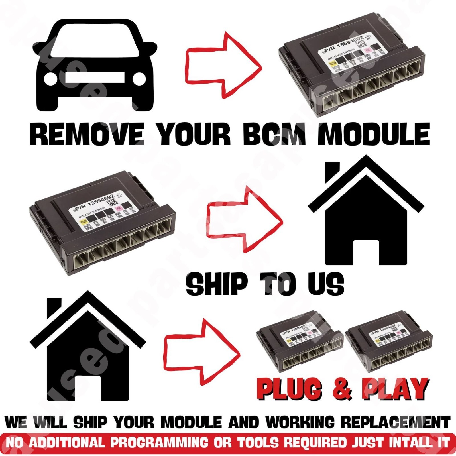 **📮 VIN PROGRAMMED PLUG & PLAY BCM BCU BODY CONTROL MODULE GM 2013-2017 13589324 📮\*** You have to send your original BCM for clonning. Body control module that will be programmed to your VIN PLUG & PLAY. No any additional programming or relearn. This service is not intended for water damaged modules. **Please match the part number with your original module before purchasing.** After purchase: 1\. 2\. 3\. Send your BCM to our address which will be provided after purchase. 4\. After we receive it we will program the replacement BCM and ship it back to you tracking.  We will contact you after your purchase in order to arrange this. Please make sure your contact information is correct.