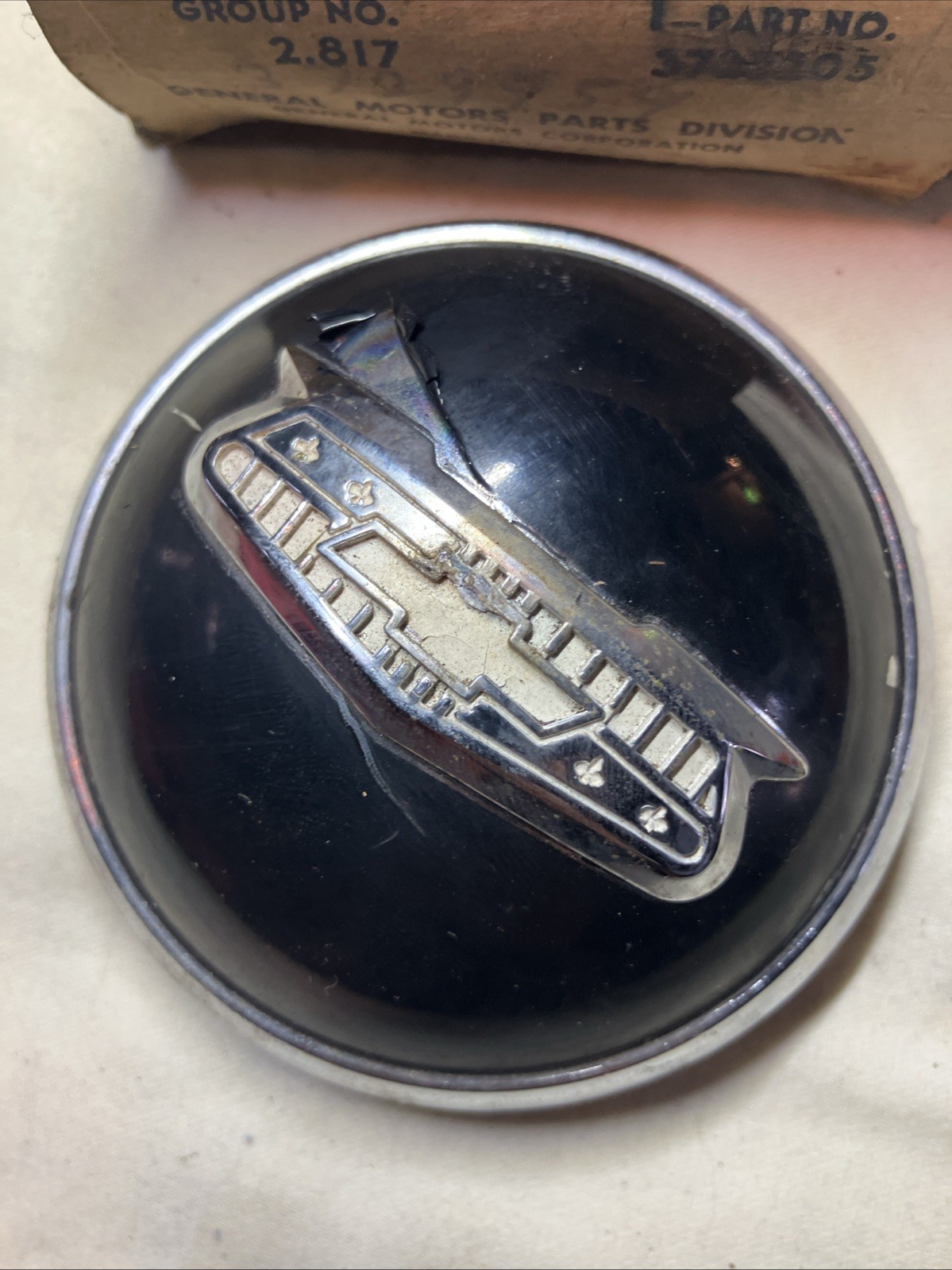 This is vintage Chevy steering wheel button. Part number on the back is 3712990