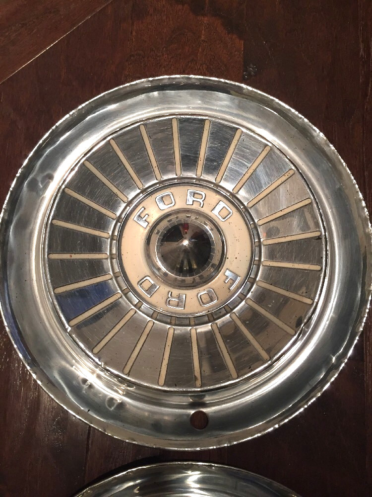 4 Ford Fairlane - thunderbird hubcaps. These are 14" hubcaps for a 1957 Model year. Average used condition with defects, driver quality. Each shows some nicks around edges ( see pics). Will clean up very nicely. Show well. As with all vintage hubcaps they are not perfect they are driver quality.