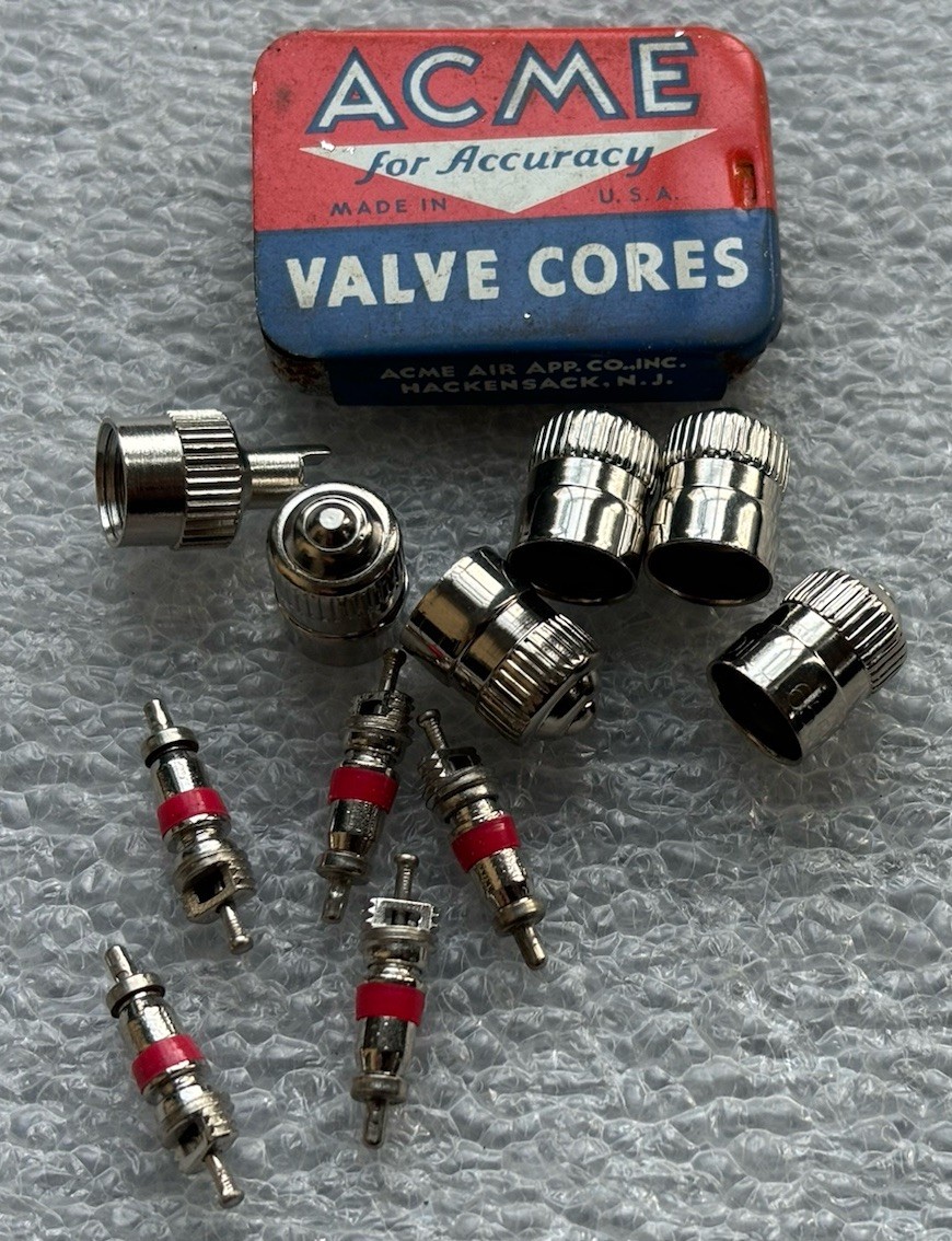 Vintage Acme Valve Cores Tin. ( contents not intended for use.) and 5 New Dill Tire Caps / 1 Core tool valve stem cap. and 5 new short valve cores.