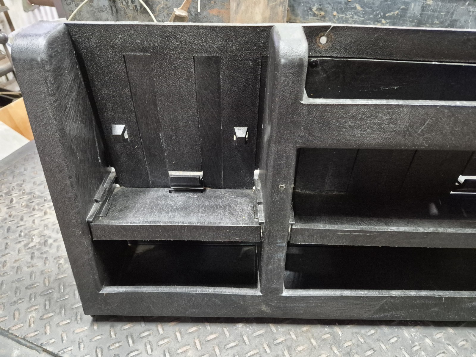 Vintage regular cab truck behind the seat storage bix organizer. This was removed from my 89 v3500 tow truck. It is black plastic, in used shape. Unknown year or manufacturer. Has a couple cracks around the mounting holes as shown in photos. I don't think I have ever seen one of these so I'm guessing pretty rare. Dimensions are in photos. Should fit multiple different year trucks such as 67-79 Ford, 73-87 gm trucks. Please see all photos, no returns. Ask any questions before purchase. Thank you!