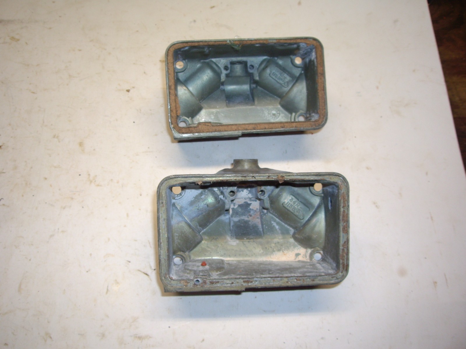 PAIR OF HOLLEY FLOAT BOWLS FROM HOLLEY 3310 CARBURATOR WHITE STUFF ON THE INSIDE NEED TO BE CLEANED