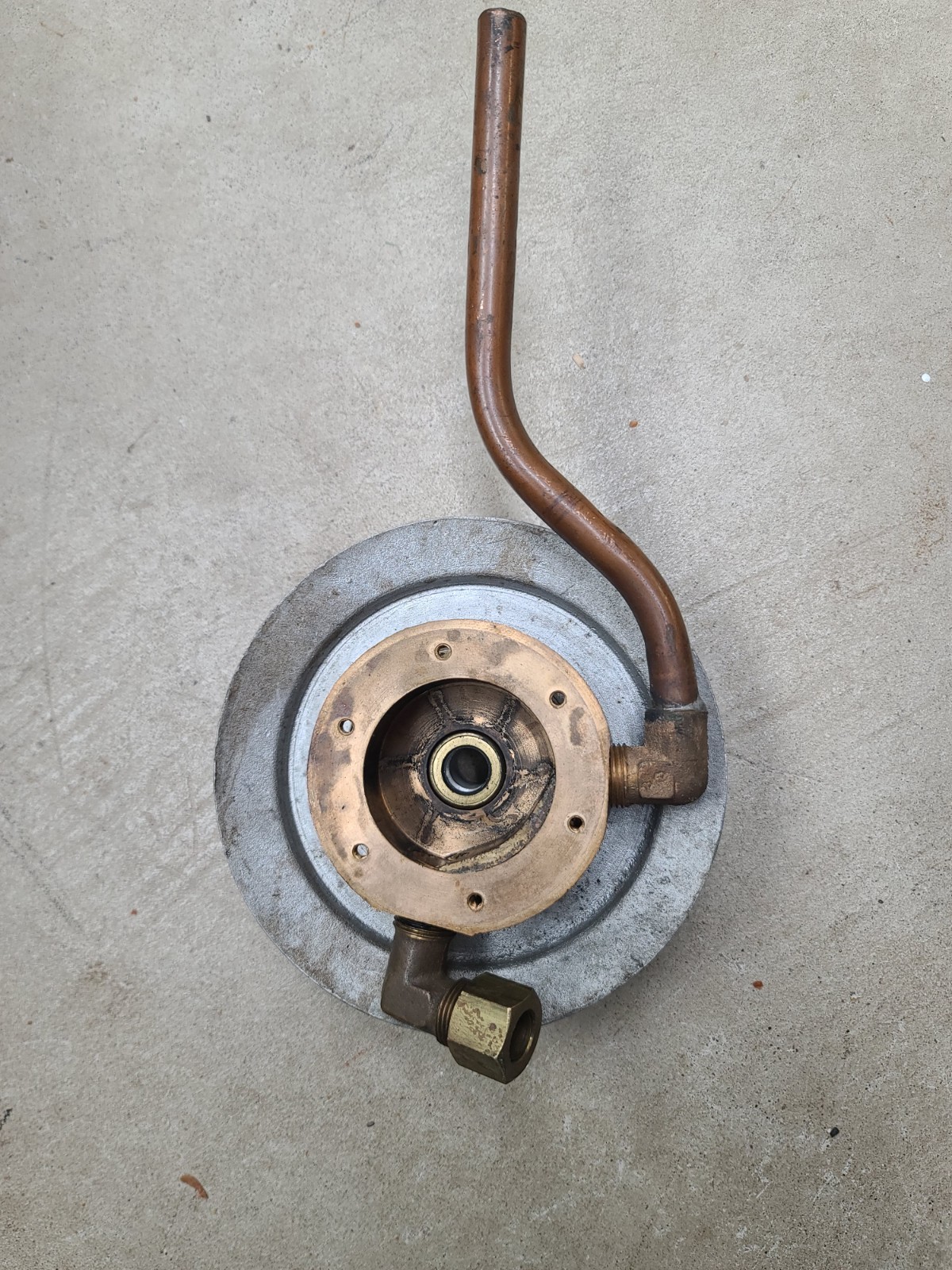 This water pump came from an Estate Sale (along with other marine parts ..brass propellers and a steering quadrant). There are no identifying numbers or markings on the pump body. The aluminum pulley does say "Federal 102". The pulley has an internal bearing which is pressed onto the nose of the pump......turns but probably needs replacing. There is a seal on the shaft as exits toward the pulley. There is a paper gasket between the back plate and the pump body. The impeller is about 3/4" thick, and 2" diameter, and is keyed to the slotted shaft with a brass screw. The inlet and output fittings were installed before the pulley wad installed....no clearance to screw them in. I have a 2nd identical pump which has not been disassembled. I do NOT know what this pump fits and my google searches have been fruitless