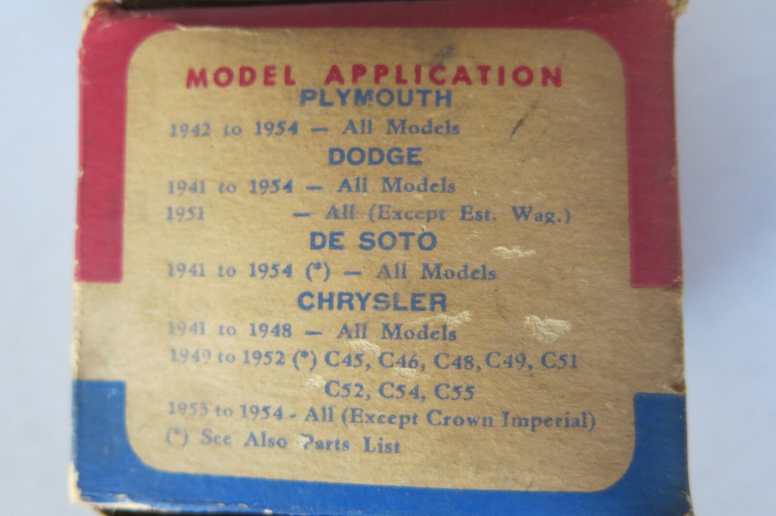 **This Listing Is For :** _Vintage Mopar Master Cylinder Repair Kit for Plymouth Dodge DeSoto Chrysler 1941-1954_ _**Part Number :**_ _1316227_ **See Pictures for Detail** **\* This** **application is for reference only. Please confirm the application with** **your dealer if you are not sure.** \- Buyer is responsible for the fitment - Please make sure you verify the item is suitable for your application. The quoted shipping prices are within the 48 states only. APO addresses, Hawaii, Alaska, and Puerto Rico etc. If the system does not show the price, please contact us \*\* **OUR STORE RETURN POLICY** Our 30 day return policy ONLY permits the return of items that are exactly as they were when sent out. **Items that are NOT ELIGIBLE for return are as follows:** -Any item that has been installed or removed from it's plastic or paper wrapper is no longer eligible for returns \- Any electrical item that has been connected to a power source or has been installed, even for testing, is not returnable \- Any engine bearings that have been removed from their original box are not eligible for return \- Any electronic components missing the security label(s) are not eligible for returns \- Any wire harnesses that have been installed or modified are not eligible for returns \- Any new item that has shows wear, evidence of installation or modification are not eligible for returns \- Any truck freight items are NOT ELIGIBLE for returns for any reason \- Any international shipment items are not eligible for return for any reason due to the shipping costs