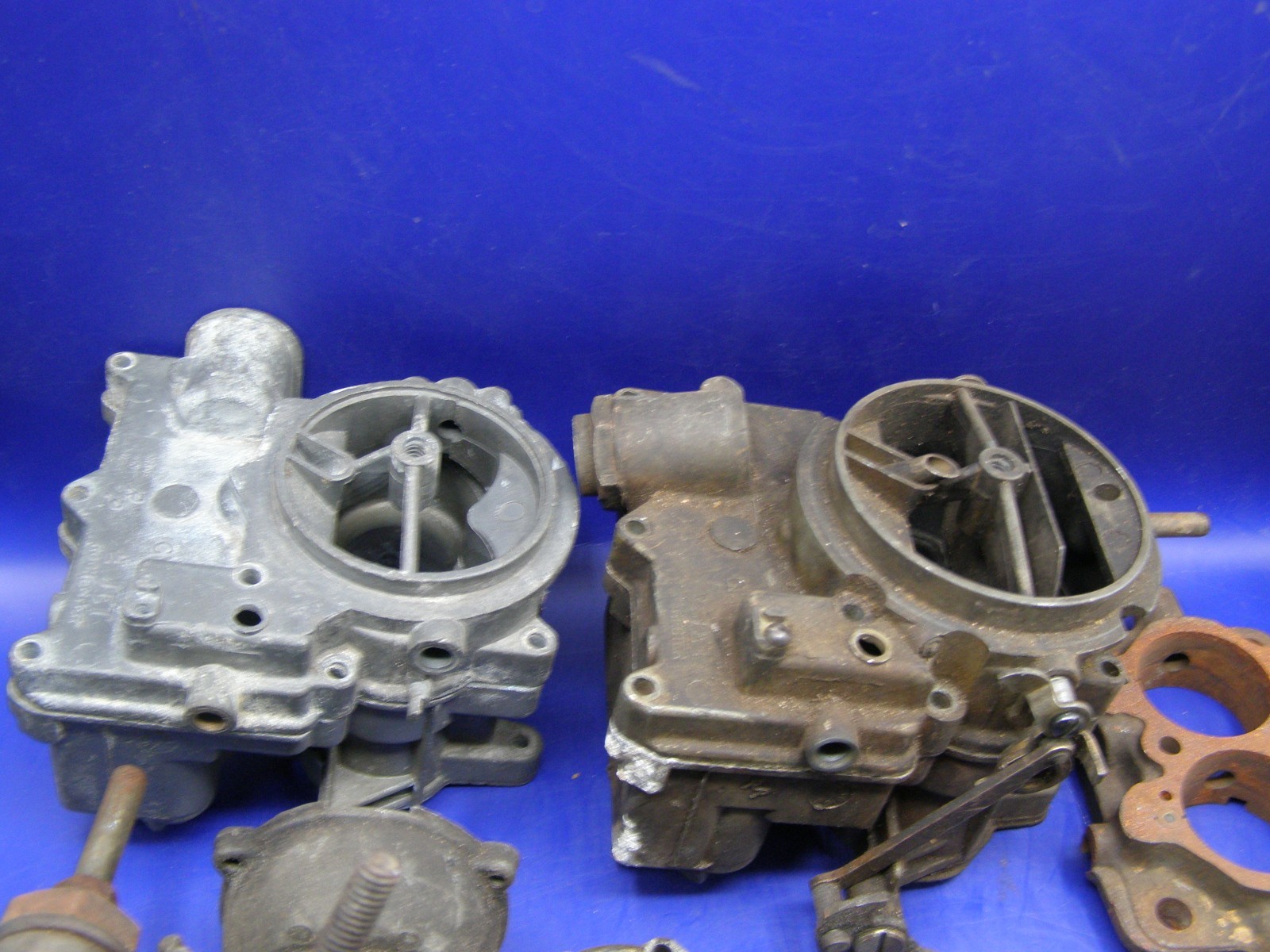 Up for bids is are Vintage Rochester 2 Jet Carburetor Parts lot. Fittings , Gaskets, Linkage , Tags. I am not sure of the application of these parts. I obtained them from an estate of a gentleman who was restoring a 1965 Pontiac GTO. The carbs are all different in some ways. There are three Different Carburetor rebuild kits . None look totally complete. There are what looks to be original metal ID tags. I am not sure if they go to the carbs pictured. There is a small paper with an exploded view of 1966 Tripower parts and linkage. I don't think it goes with the parts. There is another instruction sheet that most likely came with one of the rebuild kits. There is also a bunch of small parts , small bolts, etc. I am not an expert on these and will try to answer any questions you may have. Please note that this lot is being sold as is for parts with no warranty or returns for any reason. Shipping is $25.00 US .