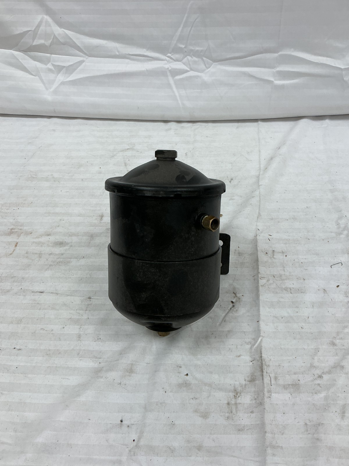 Vintage remote oil filter canister. Has 2 fittings, 7/16"-24 thread for 1/4" inverted flare line, one on the side, the other on the bottom. Fittings and threads are in great condition. Has an attached mounting clamp with 4, 1/4" bolt holes 4-1/4" on center across, and 1-1/8" on center high. Canister is refinished in satin black.