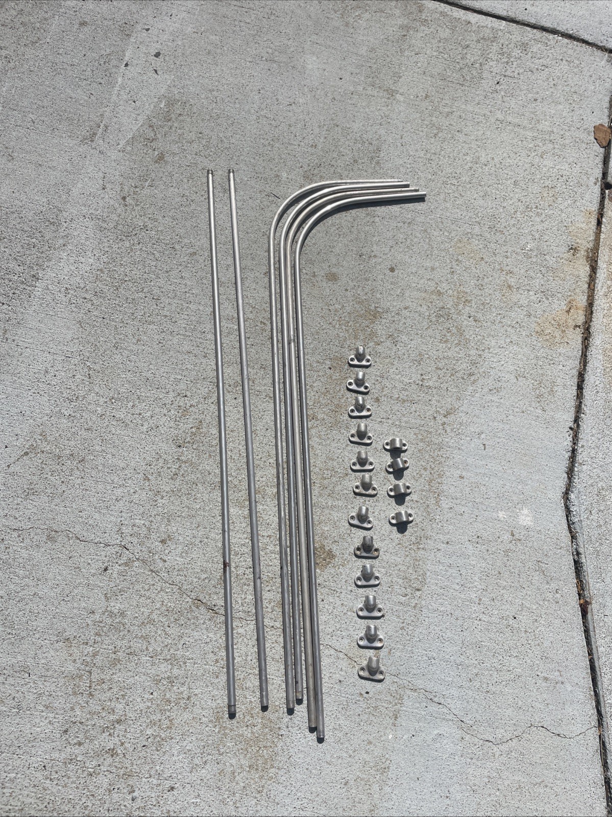 These are original parts. Believed to be from a 1961 15 window bus but can't be sure of year. Four curved pieces and two straight. Has four center mounts and twelve end mounts. One of the straight bars has had the end trimmed slightly, I don't know why. See pictures.