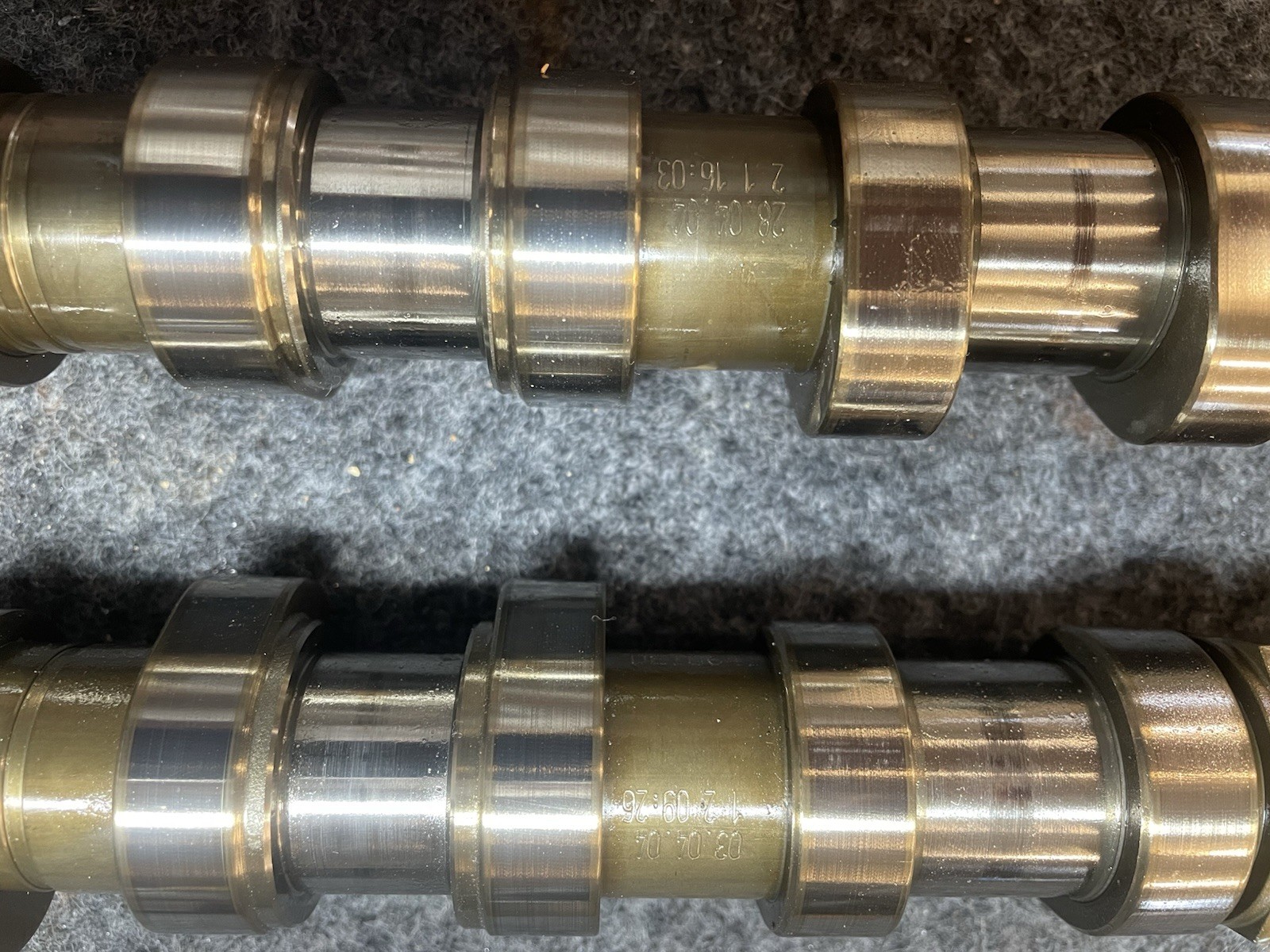 **Factory Golf R32 camshafts. Very good used condition, includes adjuster oil rings.** **From my personal project, I swapped to a set of aftermarket cams. These would be good to have if you were returning one to stock or to repair valvetrain damage.**