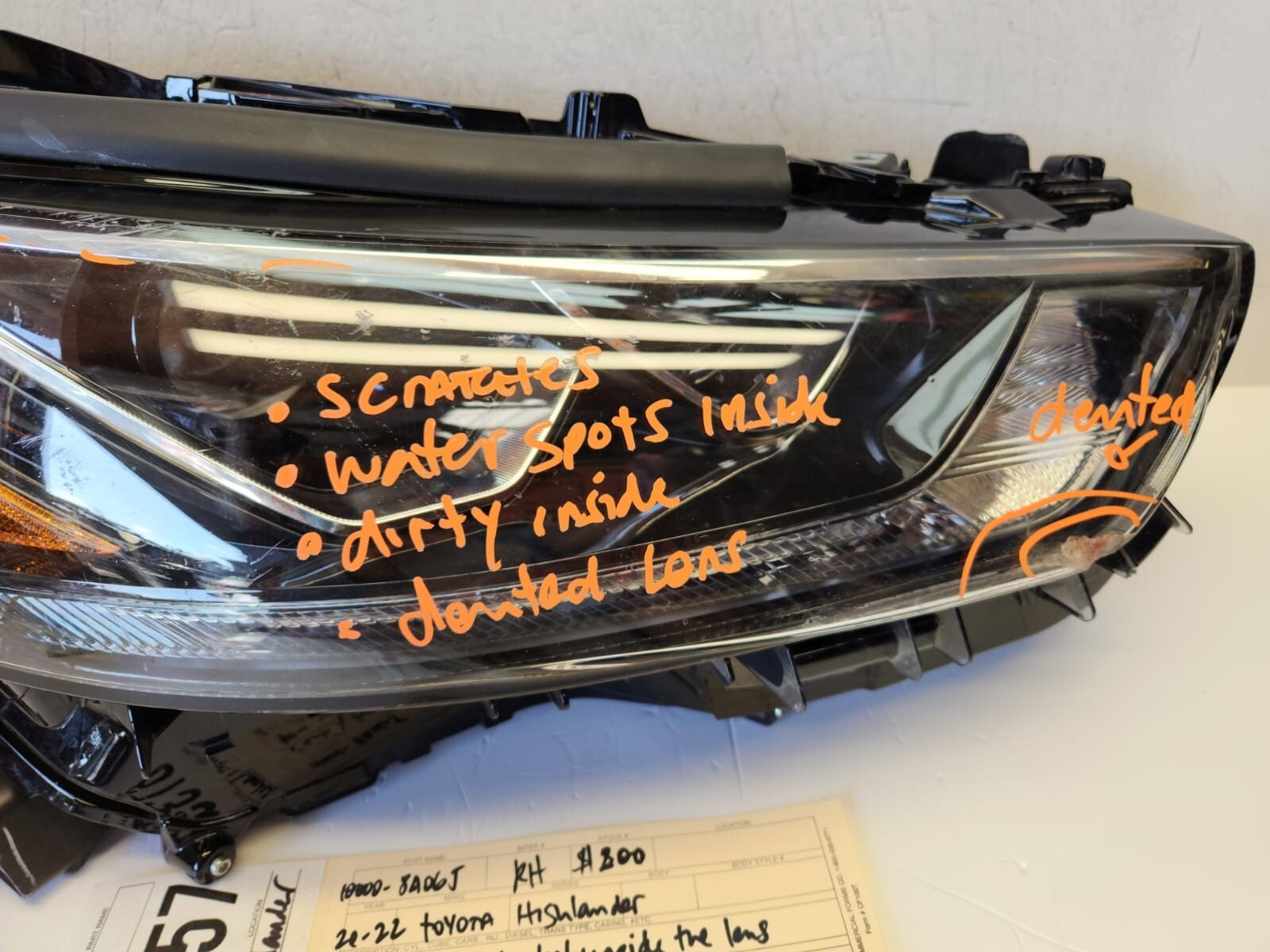 **This is an ORIGINAL FACTORY PART, not an aftermarket one.** **2020-2022 TOYOTA HIGHLANDER RIGHT FULL LED HEADLIGHT OEM** **(led tested and working good)** **DESCRIPTION:** - It will come exactly as you see on pictures. - Headlight is in **poor****used** conditions. - **1 tab well repaired, see photos please.** - **Dirty inside the lens, dented, repaired and scratches all around.** - Lens has some normal road wear and light scuff for been stored. - Bulbs might be included on some headlights **(see pictures please)**. - Model and year is based on the of our knowledge and is 98%. Please **compare part number and pictures very carefully.** **SHIPPING INFO:** - Shipments are sent via USPS, FedEx or UPS ground. - We will only ship to confirmed addresses if paid through PayPal. - We will try to ship as soon as possible. **FEEDBACK:** - If for any reason at all you are not satisfied 100% PLEASE contact us before leaving feedback so we can rectify the situation. We are human and make mistakes too. We shoot for 100% satisfaction so please let us know how we can help you. **RETURNS:** - We will accept all returns if part does not match with description or for any reason. **Please check part number and pictures before You buy this part, We list them how they are and try to sell for the best value and best price for our costumers. For more information feel free to email me, thanks for watching and good luck.**