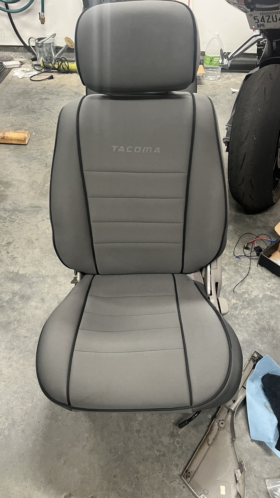Charcoal grey, full black piping, Tacoma logo. Passenger side nearly perfect. Driver side has some wear, and logo rubbed clean off with usage, see pics. Both are / have been kept clean. Full map pockets on both. SEATS NOT INCLUDED