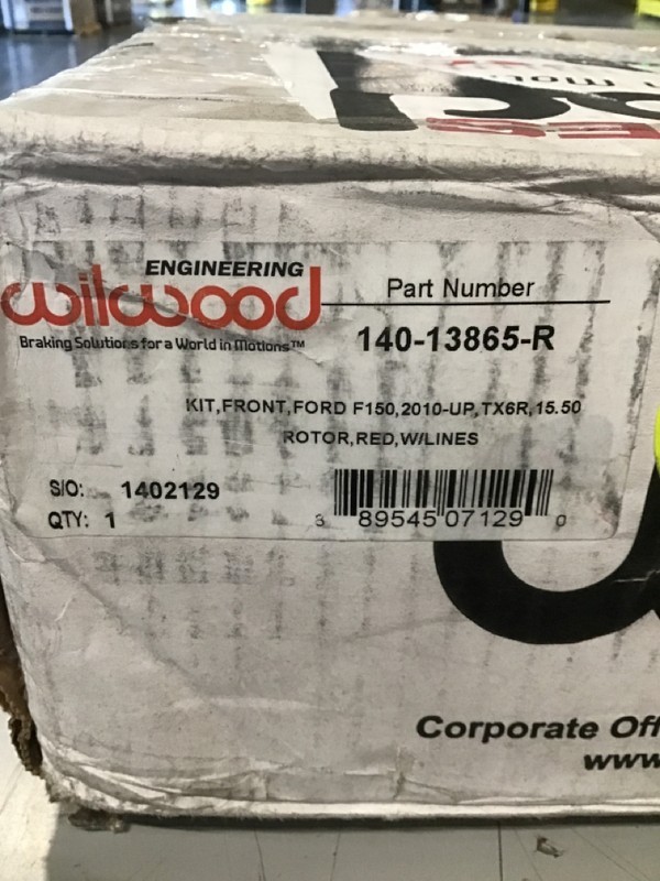 **Wilwood TX6R Front Kit 15.50in Red 2010-Up Ford F150 (6 lug)** **Part Number:140-13865-R** **NOTE: WILL NOT FIT 7 LUG MODELS!** **PRODUCT OVERVIEW** Wilwood’s Tactical Extreme TX6R Big Brake kits are ultimate in braking performance for Truck, SUV and Armored Vehicles. Using TX6R radial mount six-piston calipers and massive 15.00” to 16.00” GT-60 directional vane Spec-37 alloy rotors, these kits deliver consistent stopping power and extreme duty durability under sustained high heat with this ready to bolt-on kit. The calipers are volume matched for compatibility with original equipment power brake system output. Kits include radial mount caliper brackets, and all the necessary hardware to complete the installation. Braided stainless steel flex lines will need to be purchased for some applications. **Wilwood TX6R Big Brake Front Kit – Red Calipers (Part #140-13865-R)** Upgrade your truck’s braking performance with Wilwood’s TX6R Big Brake Front Kit, engineered for heavy-duty applications and high-performance street or off-road use. Precision-manufactured in the USA, this kit delivers unmatched stopping power, heat management, and style. **Features:** TX6R Six-Piston Red Calipers – CNC-machined aluminum construction for strength and reduced weight 15.50" GT Slotted Rotors – High-friction performance and cooler operation under load Forged Aluminum Hats & High-Strength Mounting Brackets Designed for 6-Lug Trucks (Will Not Fit 7-Lug Models) Proudly Made in the USA **Fitment:** **Ford Expedition (2010–2015)** 4x2 4x4 **Lincoln Navigator (2010–2015)** 4x2 4x4 **Ford F-150 (6-Lug Models Only)** FX2 2010–2014 \| 4x2 2014 \| 4x4 FX4 2010–2013 \| 4x4 **Harley-Davidson Edition** 2010–2012 \| 4x2, 4x4 **King Ranch** 2010–2014 \| 4x2, 4x4 2015–2018 \| Manual or Electronic Park Brake 2019–2020 \| All trims **Lariat** 2010–2014 \| 4x2, 4x4 2011 \| Lariat Limited 4x2, 4x4 2015–2018 \| Manual or Electronic Park Brake 2019–2020 \| All trims **Limited** 2013–2014 \| 4x2, 4x4 2016–2018 \| Manual or Electronic Park Brake 2019–2020 \| All trims **Platinum** 2010–2014 \| 4x2, 4x4 2015–2018 \| Manual or Electronic Park Brake 2019–2020 \| All trims SSV / Police Responder 2016–2018 \| Manual or Electronic Park Brake (SSV) 2019–2020 \| Police Responder, SSV STX **2010–2014 \| 4x2, 4x4** **XL** 2010–2014 \| 4x2, 4x4 2015–2018 \| Manual or Electronic Park Brake 2019–2020 \| All trims **XLT** 2010–2014 \| 4x2, 4x4 2015–2018 \| Manual or Electronic Park Brake 2019–2020 \| All trims **Specifications:** Rotor Diameter: 15.50" Rotor Thickness: 1.38" (35mm) Weight: ~101 lbs (complete kit with packaging) Caliper Finish: Red Powder Coat Wilwood Part Number: 140-13865-R **Includes:** TX6R Red 6-Piston Calipers GT Slotted Rotors (Pair) Billet Aluminum Hats High-Performance Brake Pads Mounting Brackets & Hardware Detailed Installation Instructions **Note:** Verify wheel clearance and 6-lug bolt pattern before purchasing. Will not fit 7-lug F-150 or SVT Rap _Disclaimer for Open Box, Scratch, and Dent Automotive Parts_ _All items listed as "Open Box," "Scratch and Dent," or "As-Is" are sold at a significant discount due to their condition. These items may include cosmetic imperfections such as scratches, dents, or signs of prior handling. Some items may be missing original packaging, accessories, or hardware._ _Please review all provided photos and the item description carefully before purchasing, as we strive to show the condition of each product accurately. It is the buyer’s responsibility to verify fitment and compatibility with their vehicle prior to purchase._ _All sales are final, and no returns or exchanges will be accepted unless explicitly stated otherwise in the listing. For any additional questions, please feel free to contact us before making your purchase. Buyer is responsible for any additional missing parts not noted in the description._ _Thank you for your understanding and for shopping with us!_