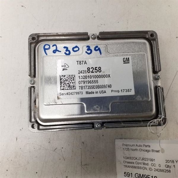 Description Donor Vehicle VIN: 1GKS2CKJ7JR231991 Model: YUKON Year: 2018 Mileage: 34000 (0 = not available or unknown) Stock Number: P23039 Store Number: 1 Part Detail Part Grade: Part Category: U Part Placement: Notes: TRANSMISSION, ID- 24288258 This part will fit these makes and models with these options WARRANTY / GUARANTEE **Return Policy** All parts we sell come with a **60 Day Money Back Guarantee** unless otherwise stated. The 60 day period starts when you take possession of the part. We do not cover the cost of labor charges during the installation of your parts. All original shipping costs are non-refundable and will be deducted by a restocking fee once the item is received. We do not cover any shipping costs and will deduct 20% to cover original shipping even if the listing says "free shipping". **Standard Warranty** We offer a standard warranty on all mechanical parts. This covers the part only, no labor charges to install the part. We are not responsible for any improper installation or misdiagnosis. Parts must be installed by a proffessional shop or mechanic. Parts that are disfunctional or bad will require paperwork along with the return or a 20% restocking fee will be applied. SHIPPING NOTESABOUT USHELP **Premium Auto Parts, Inc.** ships to US addresses within the continental 48 states. **Shipping to Alaska, Hawaii, Puerto Rico, APO, FPO or PO Box addresses** is available for select parts only. **Local Pick-up at our facilities is available.** Please contact us prior to your purchase to arrange local pick-up. Buyer must contact us prior to local pick-up. **Items returned by the buyer-** All returns are subject to a restocking fee, this restocking fee is to cover our original shipping costs. Restocking fee will be applied to all items that are returned by the buyer with no fault of the seller. This includes any items ordered incorrectly ( it is 100% buyer responsiblility to check compatability by vin number before ordering). **Please contact us prior to purchasing this part** if you have any questions regarding our business policies, the warranties or guaranties we offer or the fitment of this part with your vehicle. **Parts Grading.** A standard code system is used to communicate the condition and quality of a part between automotive recyclers, automotive repair shops, and insurers. Knowing how these codes are used will help you understand whether the part meets your expectations before you buy it and what you can expect from the part when you receive it. **A Grade** \- The highest quality part. It is of low miles and/or exceptional condition for its age. **B Grade** \- The second level quality part. It is of average miles and normal condition for its age. **C Grade** \- The third level quality part. It has high miles and/or light damage. **No Grade** \- A part that has not yet been graded.