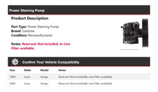 1999 Isuzu Amigo Reservoir Not Included; In-Line Filter available;. 2000 Isuzu Amigo Reservoir Not Included; In-Line Filter available;. Power Steering Pump; Steering Pump; Pump; Hydraulic Power Steering Pump.