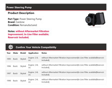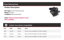 Power Steering Pump; Steering Pump; Pump and Reservior. Part Type: Power Steering Pump. Remanufactured Power Steering Pump. Pwr Steering Pump. Ensure that this part fits your vehicle by entering your vehicle's Year, Make, Model, Trim, and Engine in the Compatibility Table.