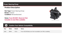 Power Steering Pump; Steering Pump; Pump; Hydraulic Power Steering Pump. 2002 BMW 325Ci From 09/2001; Reservoir Not Included; In-Line Filter available; ;. Part Type: Power Steering Pump. Remanufactured Power Steering Pump.