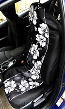 Hawaiian Hibiscus B&W Full Car Seat Cover Set + Steering Wheel Cover. ~ Set Includes 2 Bucket Seat Covers with Integrated Headrests, Bench Back of Seat Cover with Black Matching Slip-On Headrest Covers and Steering Wheel Cover.