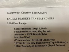 The 2010 Ford Escape Custom Seat Covers in Saddle Blanket Tan are designed by Coverking to provide a perfect fit for both front and rear seats. Made from durable neoprene material, these seat covers are cushioned for added comfort and feature a storage pouch for convenient storage. With UV-resistant properties, these custom seat covers are a practical and stylish addition to your vehicle. Proudly manufactured in the United States, these seat covers offer performance and a custom fit for your Ford Escape. Some wear as shown but overall they are in excellent condition and were well taken care of. Front and back images of all 4 seat covers.