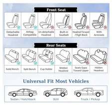 2 front seat covers with head pillows and 3 rear seat covers, which are compatible with most Cars, SUV, Trucks and Pick-ups. Used in my Nissan Altima. Water damage to the back of one of the backseat covers but does not show on the front. Center console cover is scratched.