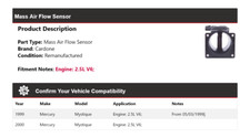 Part Type: Mass Air Flow Sensor. Remanufactured Mass Air Flow Sensor. Air Flow Sensor. Ensure that this part fits your vehicle by entering your vehicle's Year, Make, Model, Trim, and Engine in the Compatibility Table.