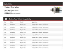 1987 Mitsubishi Mighty Max Engine: 2.0L L4; Manual Transmission;. 1988 Mitsubishi Mighty Max Engine: 2.0L L4; Manual Transmission;. 1989 Mitsubishi Mighty Max Engine: 2.0L L4; Manual Transmission;. Bosch Premium 100% Remanufactured Starter.