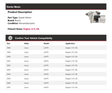 For 1998-2007 Lexus LX470 4.7L V8 Bosch Starter (Remanufactured). Lexus LX470 Starter Motor. 1998 Lexus LX470 Engine: 4.7L V8;. 1999 Lexus LX470 Engine: 4.7L V8;. 2000 Lexus LX470 Engine: 4.7L V8;. 2001 Lexus LX470 Engine: 4.7L V8;.