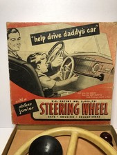 A unique American made toy from 1947. Enabling kids to turn anything into a car. Rubber extender appears broken and shortened. Missing manual. Horn comes off but stays in on its own. Box has writing on bottom. Thick plastic wheel has stains from age. Message me any question, thanks for checking out my listing!