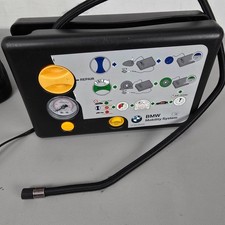 Designed with precision, it includes a built-in pressure gauge and adapter storage. Tested (still has tire repair liquid in it). Missing tire pressure gauge. Part of label missing. Bag has minor wear.