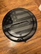 This is a used Black and Dark gray American flag rear wheel cover that came off of a JLU sport jeep wrangler 245/75 R17. The shell is hard and the walls are soft with back up Camera hole.