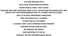 2010-2020 ASTON MARTIN RAPIDE. GENUINE OEM PART REMOVED FROM A 2011 ASTON MARTIN RAPIDE WITH 40K MILES THAT WAS DISSASEMBLED DUE TO A FRONT END COLLISION. GENUINE ASTON MARTIN PART. TRUNK PARCEL SHELF TRAY COVER.