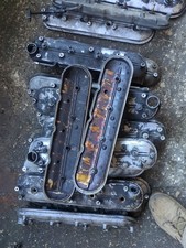LH and RH set of Jaguar cam covers, part numbers C43521A D1286 and C43531A D1287. These are used parts in need of refinishing. The side with the oil cap does have a crack between the two bolt holes closest to the timing side. See pictures for condition. Buyer is responsible for verifying correct fitment before purchase.