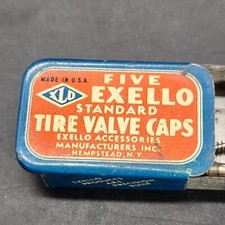 Nice Vtg EXELLO XLO VALVE CAP TIN w Sliding Lid & 1 NOS Chrome Cap & 2 Valve Core & nice graphics. Made in the USA. Please see photos for more details and to evaluate condition for yourself