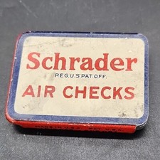 Nice Vintage SCHRADER TIRE AIR CHECKS TIN with Sliding Lid & 1 NOS Ck & Install Tool USA. Nice graphics on metal tin. Includes 1 New air check core and an install tool. Made in the USA. Please see photos for more details and to evaluate condition for yourself