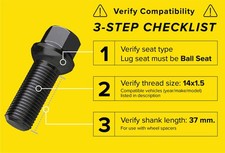These lug bolts only work on vehicles with the following thread size/pitch: 14x1.5 | 14mmx1.5 | M14x1.5 | 14x1.5mm | UNF RH. Buyers need to ensure their wheels have Ball Seat R12 lug holes. Buyers also need to verify that the 37mm shank length is correct for their application. NOTE that eBay's "This fits your vehicle" feature does not check/confirm that this item is the appropriate shank length. We cannot know what shank length you need, so it is important for buyers to take proper measurements. Please click into this section to view important fitment information and additional details about the item.