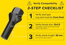 These lug bolts only work on vehicles with the following thread size/pitch: 12x1.5 | 12mmx1.5 | M12x1.5 | 12x1.5mm | UNF RH. Buyers need to ensure their wheels have Cone Seat (60 Degree Taper) lug holes. Buyers also need to verify that the 30mm shank length is correct for their application. NOTE that eBay's "This fits your vehicle" feature does not check/confirm that this item is the appropriate shank length. We cannot know what shank length you need, so it is important for buyers to take proper measurements. Please click into this section to view important fitment information and additional details about the item.