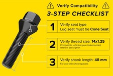 These lug bolts only work on vehicles with the following thread size/pitch: 14x1.25 | 14mmx1.25 | M14x1.25 | 14x1.25mm | UNF RH. Buyers need to ensure their wheels have Cone Seat (60 Degree Taper) lug holes. Buyers also need to verify that the 48mm shank length is correct for their application. NOTE that eBay's "This fits your vehicle" feature does not check/confirm that this item is the appropriate shank length. We cannot know what shank length you need, so it is important for buyers to take proper measurements. Please click into this section to view important fitment information and additional details about the item.